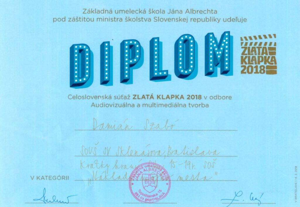 Mimoriadne úspešne reprezentoval našu školu v piatom ročníku celoslovenskej súťaže v audiovizuálnej a multimediálnej tvorbe „Zlatá klapka“ študent tretieho ročníka…